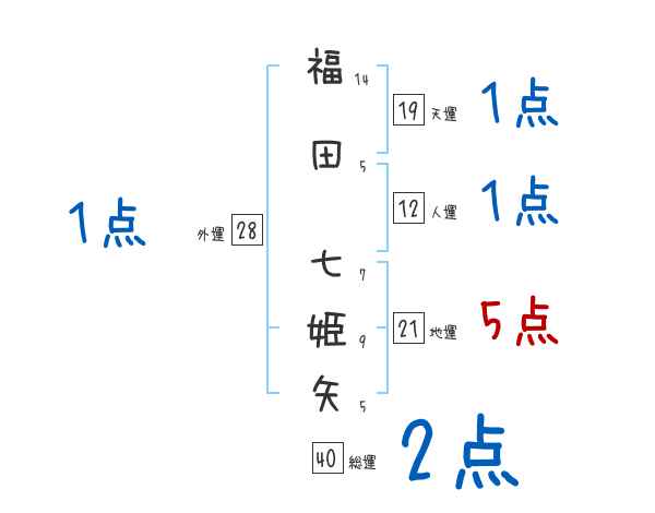 外運![]() | 福田七姫矢さんの外運は28画の1つ星!家庭環境に注意。スポーツで活躍できる能力があるかも。 生活面を象徴する運勢です。外部から受ける影響力を表し、結婚運、家庭運や職場、環境への順応性を表します。 |