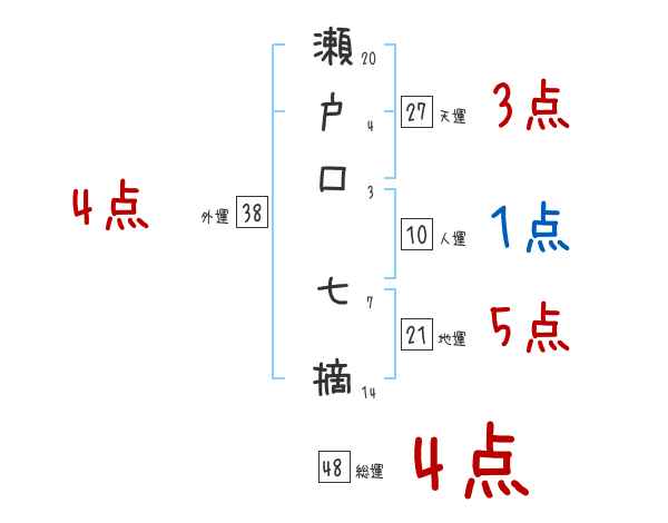天運![]() | 瀬戸口七摘さんの天運は27画の3つ星!頭脳明晰だが強情で摩擦が多い傾向。孤立に注意。 家系が持つ宿命的な運勢を表します。祖先から受け継いだ苗字ですので自分の力が及びません。家柄を象徴します。 |