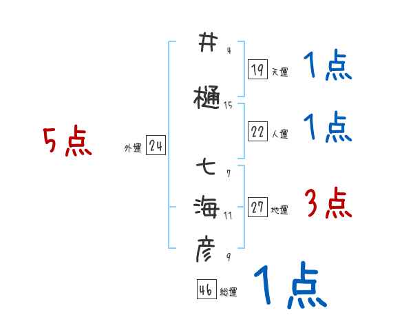 外運![]() | 井樋七海彦さんの外運は24画の5つ星!家庭運が良く順調な人生。金運にも恵まれる。 生活面を象徴する運勢です。外部から受ける影響力を表し、結婚運、家庭運や職場、環境への順応性を表します。 |