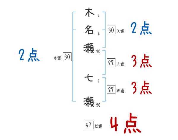 総運![]() | 木名瀬七瀬さんの総運は57画の4つ星!向上心があり人望がある。地位を得る。 あなたの人生を表す1番重要な運勢です。生涯を通じて影響する総合運となり、主に50歳以降の晩年期に影響を及ぼします。 |