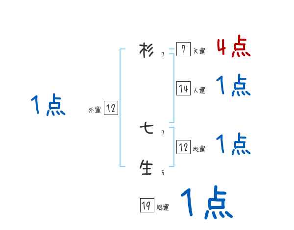 天運![]() | 杉七生さんの天運は7画の4つ星!強い意志や信念を持ち独立心が強い。自立する。 家系が持つ宿命的な運勢を表します。祖先から受け継いだ苗字ですので自分の力が及びません。家柄を象徴します。 |