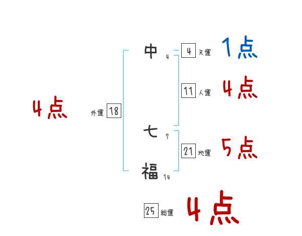 天運![]() | 中七福さんの天運は4画の1つ星!感情が不安定で苦労するかも。周囲との協調を心掛けましょう。 家系が持つ宿命的な運勢を表します。祖先から受け継いだ苗字ですので自分の力が及びません。家柄を象徴します。 |