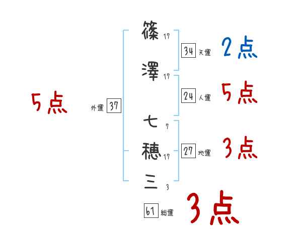 人運![]() | 篠澤七穂三さんの人運は24画の5つ星!家庭運が良く順調な人生。金運にも恵まれる。 性格や才能などを表す2番目に重要な運勢です。人間関係や協調性、社会的な成功に影響します。主に20歳から50歳ぐらいまでの中年期の運勢を表します。 |