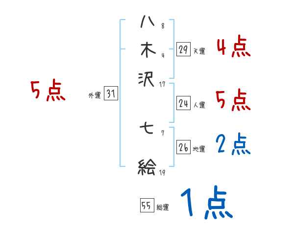 外運![]() | 八木沢七絵さんの外運は31画の5つ星!社交性があり判断力に優れる。順風満帆な人生で円満な生活。 生活面を象徴する運勢です。外部から受ける影響力を表し、結婚運、家庭運や職場、環境への順応性を表します。 |
