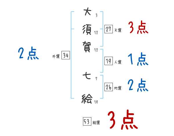| 外運  | 大須賀七絵さんの外運は34画の2つ星!独創性に優れるが、自尊心が強く災難に注意しましょう。生活面を象徴する運勢です。外部から受ける影響力を表し、結婚運、家庭運や職場、環境への順応性を表します。 |