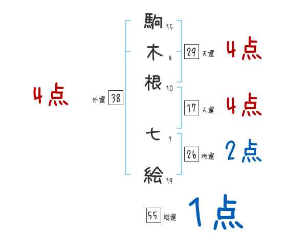 天運![]() | 駒木根七絵さんの天運は29画の4つ星!完全主義で才能がある。厳格な心の持ち主。 家系が持つ宿命的な運勢を表します。祖先から受け継いだ苗字ですので自分の力が及びません。家柄を象徴します。 |