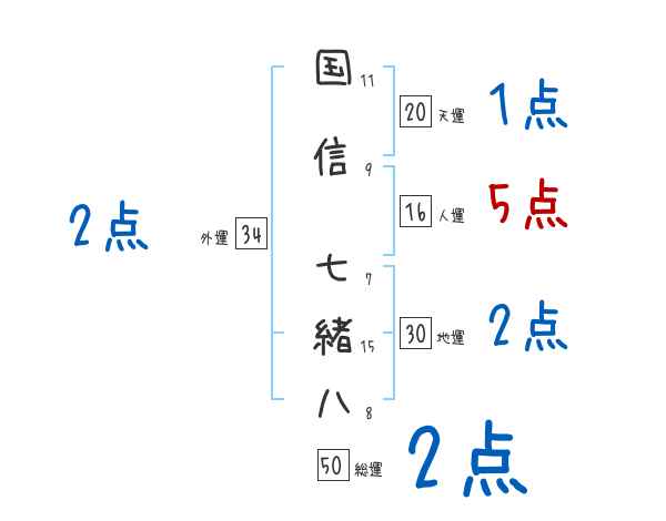 人運![]() | 国信七緒八さんの人運は16画の5つ星!人望が厚く大きく発展する。逆転成功が見える。 性格や才能などを表す2番目に重要な運勢です。人間関係や協調性、社会的な成功に影響します。主に20歳から50歳ぐらいまでの中年期の運勢を表します。 |