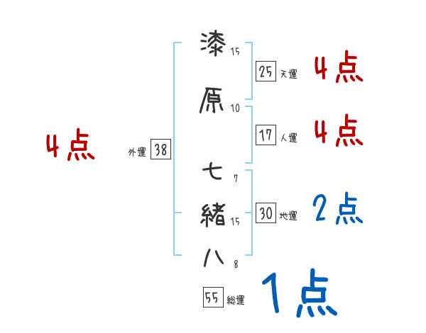 | 外運  | 漆原七緒八さんの外運は38画の4つ星!温厚な性格で技術的な才能を発揮する。職人的な仕事に向いている。生活面を象徴する運勢です。外部から受ける影響力を表し、結婚運、家庭運や職場、環境への順応性を表します。 |