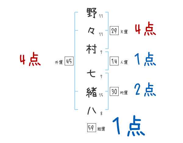 天運![]() | 野々村七緒八さんの天運は29画の4つ星!完全主義で才能がある。厳格な心の持ち主。 家系が持つ宿命的な運勢を表します。祖先から受け継いだ苗字ですので自分の力が及びません。家柄を象徴します。 |