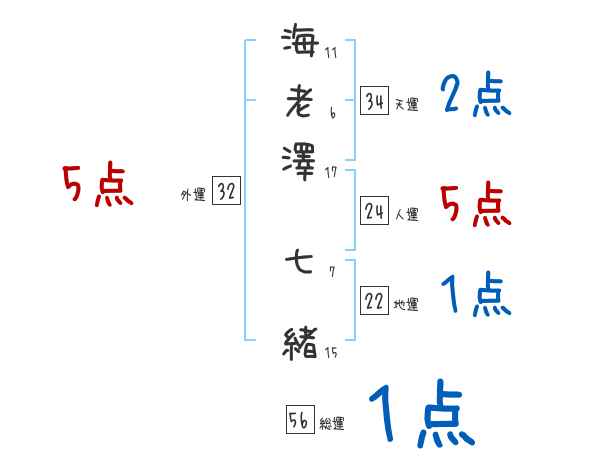 外運![]() | 海老澤七緒さんの外運は32画の5つ星!柔軟性があり成功する。チャンスが多く金運が良い。 生活面を象徴する運勢です。外部から受ける影響力を表し、結婚運、家庭運や職場、環境への順応性を表します。 |