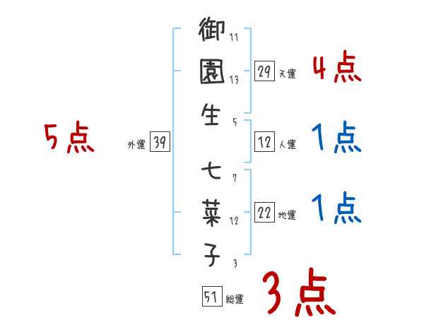 総運![]() | 御園生七菜子さんの総運は51画の3つ星!変化が激しく、危険に注意。堅実な性格。 あなたの人生を表す1番重要な運勢です。生涯を通じて影響する総合運となり、主に50歳以降の晩年期に影響を及ぼします。 |