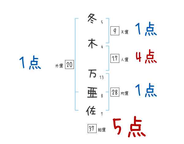 天運![]() | 冬木万亜佐さんの天運は9画の1つ星!消極的で才能を発揮することが苦手なことも。周りの意見に耳を傾けましょう。 家系が持つ宿命的な運勢を表します。祖先から受け継いだ苗字ですので自分の力が及びません。家柄を象徴します。 |