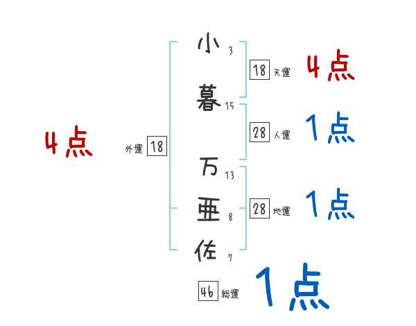 天運![]() | 小暮万亜佐さんの天運は18画の4つ星!情熱的で剛気。忍耐力があり信頼される。 家系が持つ宿命的な運勢を表します。祖先から受け継いだ苗字ですので自分の力が及びません。家柄を象徴します。 |