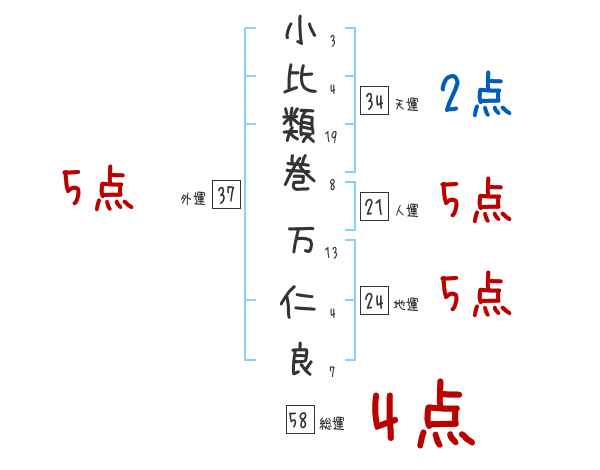 外運![]() | 小比類巻万仁良さんの外運は37画の5つ星!努力家で順応性に優れる。現実的な考え方ができ忠実に物事をこなす。 生活面を象徴する運勢です。外部から受ける影響力を表し、結婚運、家庭運や職場、環境への順応性を表します。 |