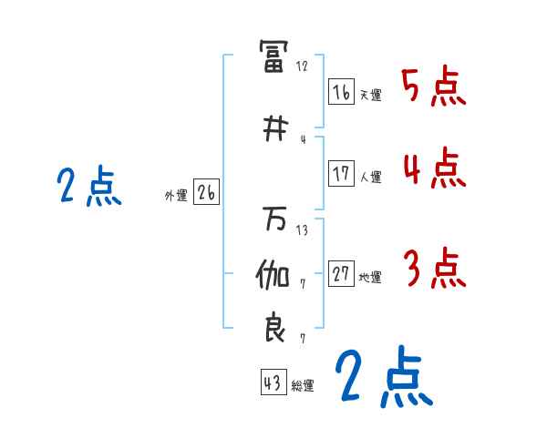総運![]() | 冨井万伽良さんの総運は43画の2つ星!頑固な性格で独立心が強いかも。やや非現実的で浪費に注意しましょう。 あなたの人生を表す1番重要な運勢です。生涯を通じて影響する総合運となり、主に50歳以降の晩年期に影響を及ぼします。 |