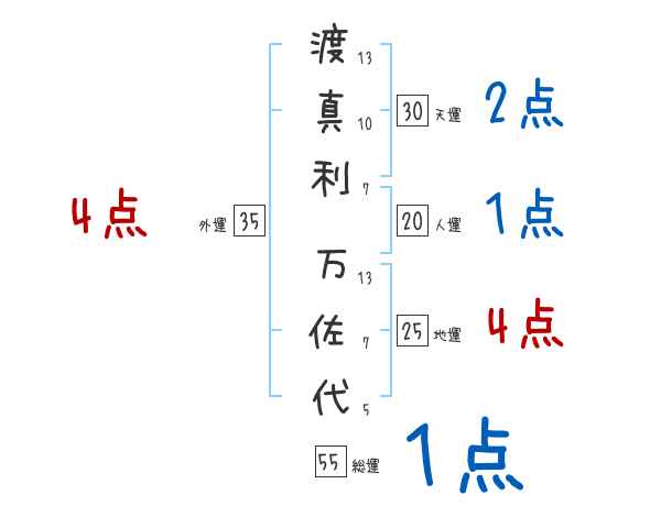 天運![]() | 渡真利万佐代さんの天運は30画の2つ星!浮き沈みの激しさに注意しましょう。 家系が持つ宿命的な運勢を表します。祖先から受け継いだ苗字ですので自分の力が及びません。家柄を象徴します。 |