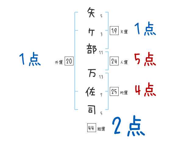 総運![]() | 矢ヶ部万佐司さんの総運は44画の2つ星!誠実で慎重な性格。物事を考えすぎないように注意しましょう。 あなたの人生を表す1番重要な運勢です。生涯を通じて影響する総合運となり、主に50歳以降の晩年期に影響を及ぼします。 |