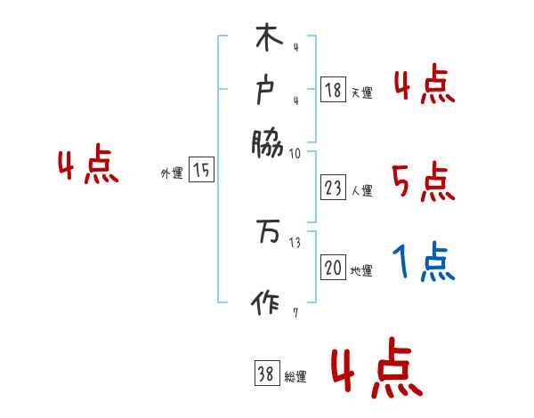 外運![]() | 木戸脇万作さんの外運は15画の4つ星!人徳があり出世する。順調に物事を進め円満な人生。 生活面を象徴する運勢です。外部から受ける影響力を表し、結婚運、家庭運や職場、環境への順応性を表します。 |