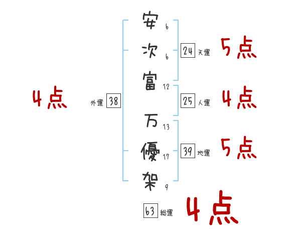 天運![]() | 安次富万優架さんの天運は24画の5つ星!家庭運が良く順調な人生。金運にも恵まれる。 家系が持つ宿命的な運勢を表します。祖先から受け継いだ苗字ですので自分の力が及びません。家柄を象徴します。 |