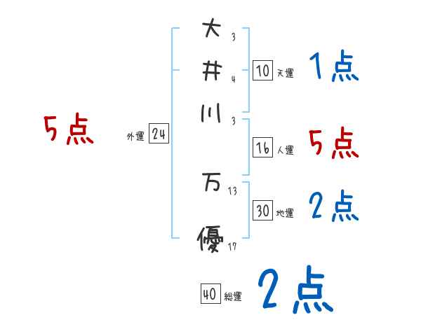人運![]() | 大井川万優さんの人運は16画の5つ星!人望が厚く大きく発展する。逆転成功が見える。 性格や才能などを表す2番目に重要な運勢です。人間関係や協調性、社会的な成功に影響します。主に20歳から50歳ぐらいまでの中年期の運勢を表します。 |