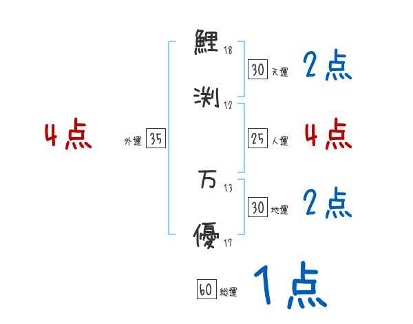 外運![]() | 鯉渕万優さんの外運は35画の4つ星!温厚な性格で感受性が高い。穏和な性格で人望が厚い。 生活面を象徴する運勢です。外部から受ける影響力を表し、結婚運、家庭運や職場、環境への順応性を表します。 |