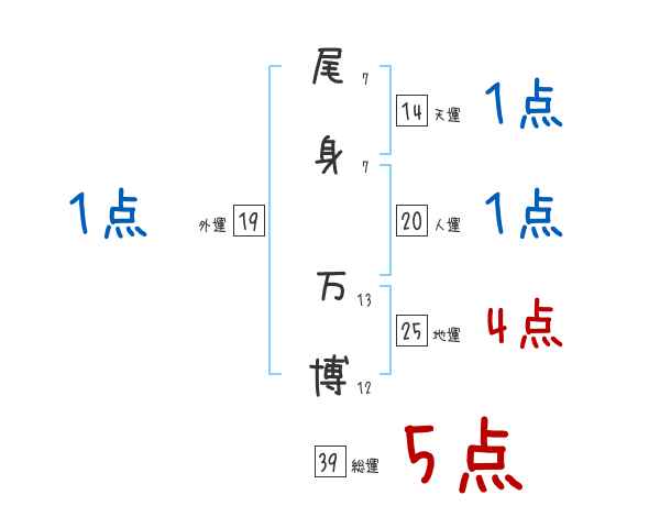 外運![]() | 尾身万博さんの外運は19画の1つ星!優れた才能を持ちますが、協調性が足りないことも。周りの人と協力する事を意識しましょう。 生活面を象徴する運勢です。外部から受ける影響力を表し、結婚運、家庭運や職場、環境への順応性を表します。 |