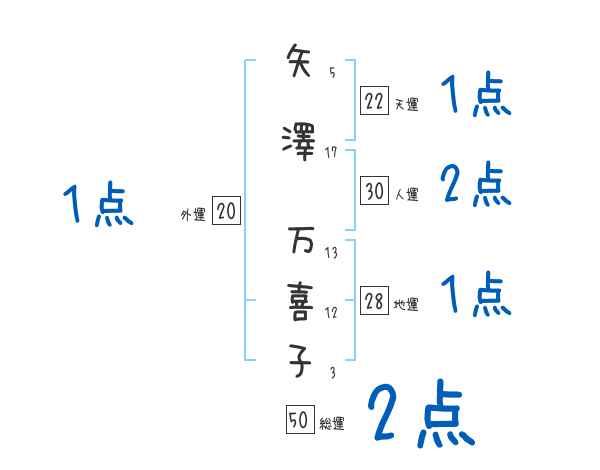 天運![]() | 矢澤万喜子さんの天運は22画の1つ星!努力することが苦手ないっぽう手先が器用。芸術性にも優れる。 家系が持つ宿命的な運勢を表します。祖先から受け継いだ苗字ですので自分の力が及びません。家柄を象徴します。 |