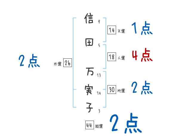 総運![]() | 信田万実子さんの総運は44画の2つ星!誠実で慎重な性格。物事を考えすぎないように注意しましょう。 あなたの人生を表す1番重要な運勢です。生涯を通じて影響する総合運となり、主に50歳以降の晩年期に影響を及ぼします。 |