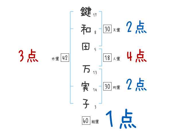 天運![]() | 鍵和田万実子さんの天運は30画の2つ星!浮き沈みの激しさに注意しましょう。 家系が持つ宿命的な運勢を表します。祖先から受け継いだ苗字ですので自分の力が及びません。家柄を象徴します。 |