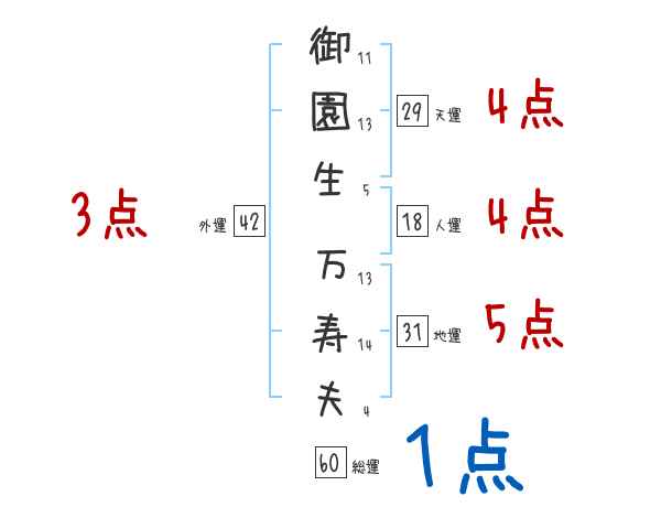 総運![]() | 御園生万寿夫さんの総運は60画の1つ星!悲観的で迷いやすい。波乱が多く損をしないように。 あなたの人生を表す1番重要な運勢です。生涯を通じて影響する総合運となり、主に50歳以降の晩年期に影響を及ぼします。 |