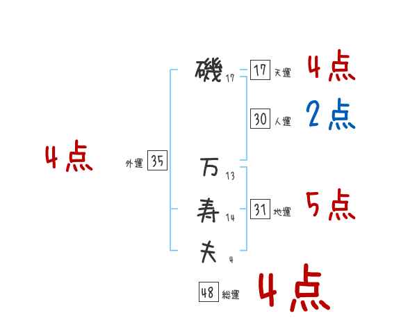 外運![]() | 磯万寿夫さんの外運は35画の4つ星!温厚な性格で感受性が高い。穏和な性格で人望が厚い。 生活面を象徴する運勢です。外部から受ける影響力を表し、結婚運、家庭運や職場、環境への順応性を表します。 |