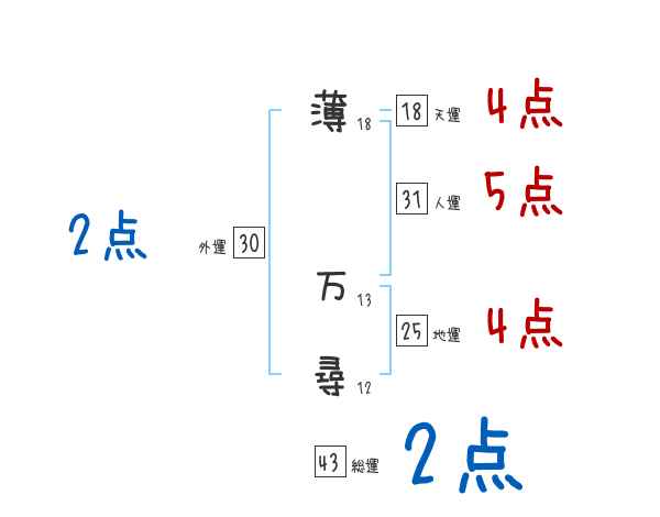 天運![]() | 薄万尋さんの天運は18画の4つ星!情熱的で剛気。忍耐力があり信頼される。 家系が持つ宿命的な運勢を表します。祖先から受け継いだ苗字ですので自分の力が及びません。家柄を象徴します。 |