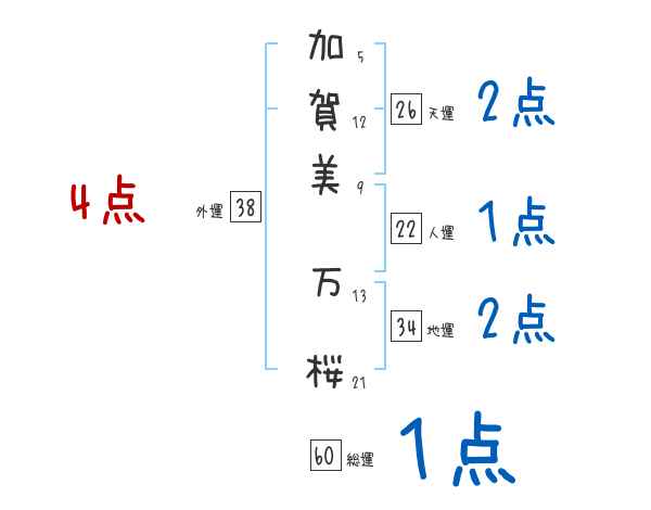 天運![]() | 加賀美万桜さんの天運は26画の2つ星!波瀾万丈かも。信頼できる人を大事にしましょう。 家系が持つ宿命的な運勢を表します。祖先から受け継いだ苗字ですので自分の力が及びません。家柄を象徴します。 |