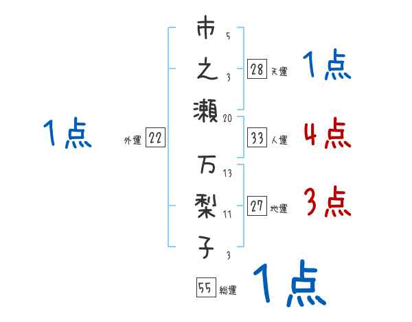 外運![]() | 市之瀬万梨子さんの外運は22画の1つ星!努力することが苦手ないっぽう手先が器用。芸術性にも優れる。 生活面を象徴する運勢です。外部から受ける影響力を表し、結婚運、家庭運や職場、環境への順応性を表します。 |