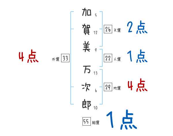 天運![]() | 加賀美万次郎さんの天運は26画の2つ星!波瀾万丈かも。信頼できる人を大事にしましょう。 家系が持つ宿命的な運勢を表します。祖先から受け継いだ苗字ですので自分の力が及びません。家柄を象徴します。 |