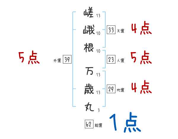 総運![]() | 嵯峨根万歳丸さんの総運は62画の1つ星!困難なトラブルが多く精神的に疲労しないように気をつけましょう。 あなたの人生を表す1番重要な運勢です。生涯を通じて影響する総合運となり、主に50歳以降の晩年期に影響を及ぼします。 |
