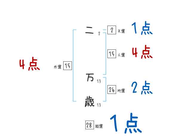総運![]() | 二万歳さんの総運は28画の1つ星!家庭環境に注意。スポーツで活躍できる能力があるかも。 あなたの人生を表す1番重要な運勢です。生涯を通じて影響する総合運となり、主に50歳以降の晩年期に影響を及ぼします。 |