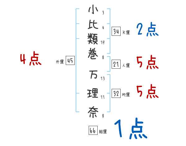 地運![]() | 小比類巻万理奈さんの地運は32画の5つ星!柔軟性があり成功する。チャンスが多く金運が良い。 個性を表す基礎的な運勢です。性格形成や対人関係、行動力など家庭環境に影響されます。主に誕生してから20歳くらいまでの若年期の運勢を表します。 |