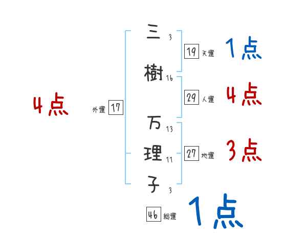| 外運  | 三樹万理子さんの外運は17画の4つ星!積極的な行動力。地位を気づき財産を手に入れる。純粋な心と直感力。生活面を象徴する運勢です。外部から受ける影響力を表し、結婚運、家庭運や職場、環境への順応性を表します。 |