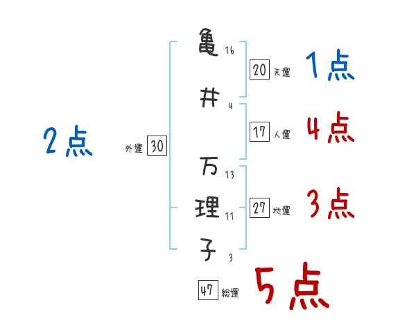 総運![]() | 亀井万理子さんの総運は47画の5つ星!実力が開花し発展する円満な人生。財に恵まれる。 あなたの人生を表す1番重要な運勢です。生涯を通じて影響する総合運となり、主に50歳以降の晩年期に影響を及ぼします。 |