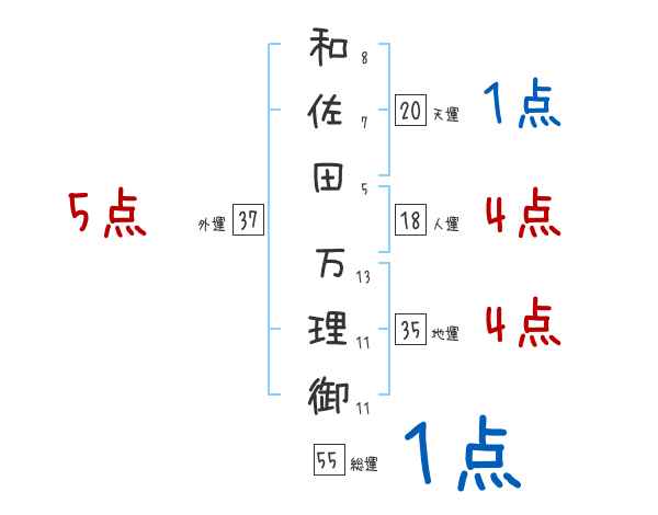 外運![]() | 和佐田万理御さんの外運は37画の5つ星!努力家で順応性に優れる。現実的な考え方ができ忠実に物事をこなす。 生活面を象徴する運勢です。外部から受ける影響力を表し、結婚運、家庭運や職場、環境への順応性を表します。 |