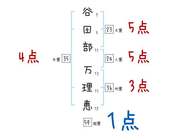外運![]() | 谷田部万理恵さんの外運は35画の4つ星!温厚な性格で感受性が高い。穏和な性格で人望が厚い。 生活面を象徴する運勢です。外部から受ける影響力を表し、結婚運、家庭運や職場、環境への順応性を表します。 |