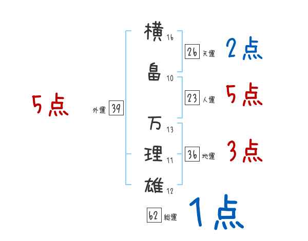 外運![]() | 横畠万理雄さんの外運は39画の5つ星!社交性に優れ人望が厚い。人の上に立ち成功する。 生活面を象徴する運勢です。外部から受ける影響力を表し、結婚運、家庭運や職場、環境への順応性を表します。 |