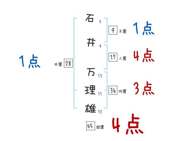 外運![]() | 石井万理雄さんの外運は28画の1つ星!家庭環境に注意。スポーツで活躍できる能力があるかも。 生活面を象徴する運勢です。外部から受ける影響力を表し、結婚運、家庭運や職場、環境への順応性を表します。 |