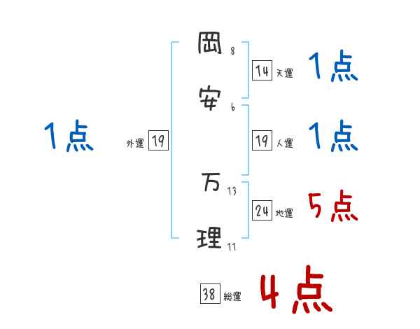 外運![]() | 岡安万理さんの外運は19画の1つ星!優れた才能を持ちますが、協調性が足りないことも。周りの人と協力する事を意識しましょう。 生活面を象徴する運勢です。外部から受ける影響力を表し、結婚運、家庭運や職場、環境への順応性を表します。 |
