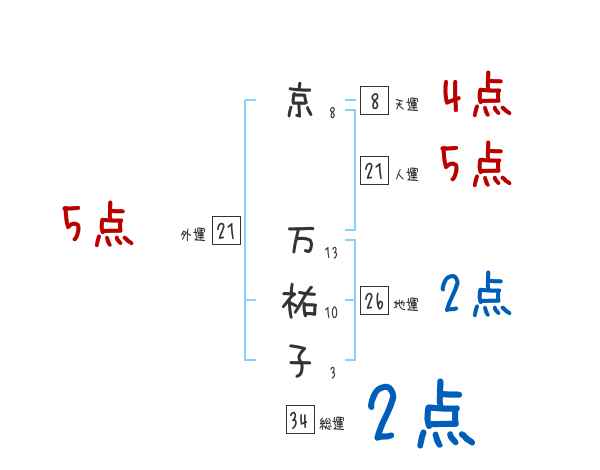 人運![]() | 京万祐子さんの人運は21画の5つ星!統率力がある。独立し成功する。名誉を手に入れる。 性格や才能などを表す2番目に重要な運勢です。人間関係や協調性、社会的な成功に影響します。主に20歳から50歳ぐらいまでの中年期の運勢を表します。 |