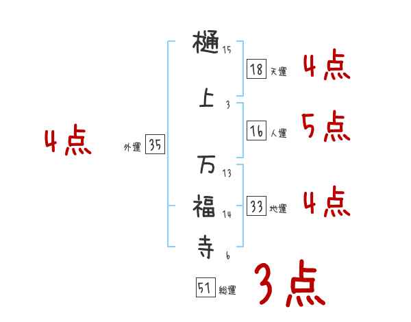 外運![]() | 樋上万福寺さんの外運は35画の4つ星!温厚な性格で感受性が高い。穏和な性格で人望が厚い。 生活面を象徴する運勢です。外部から受ける影響力を表し、結婚運、家庭運や職場、環境への順応性を表します。 |