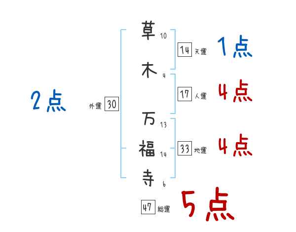 総運![]() | 草木万福寺さんの総運は47画の5つ星!実力が開花し発展する円満な人生。財に恵まれる。 あなたの人生を表す1番重要な運勢です。生涯を通じて影響する総合運となり、主に50歳以降の晩年期に影響を及ぼします。 |