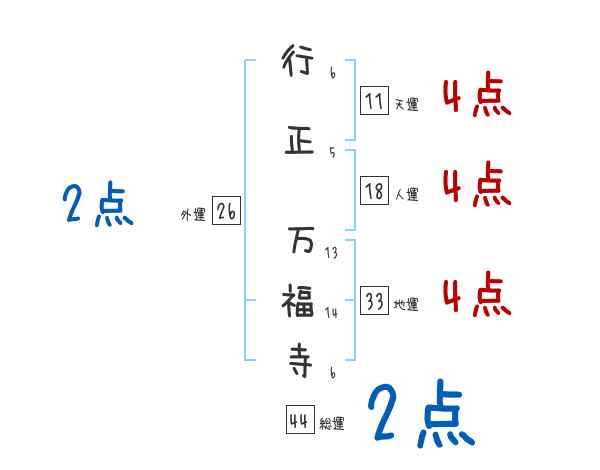 天運![]() | 行正万福寺さんの天運は11画の4つ星!着実に富や地位を得る幸運な人生。 家系が持つ宿命的な運勢を表します。祖先から受け継いだ苗字ですので自分の力が及びません。家柄を象徴します。 |