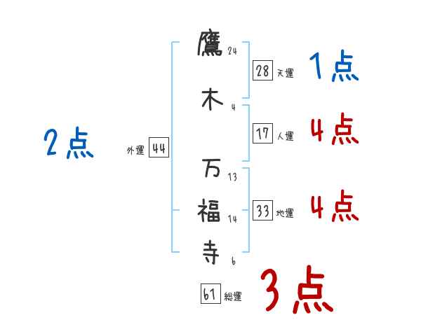 天運![]() | 鷹木万福寺さんの天運は28画の1つ星!家庭環境に注意。スポーツで活躍できる能力があるかも。 家系が持つ宿命的な運勢を表します。祖先から受け継いだ苗字ですので自分の力が及びません。家柄を象徴します。 |